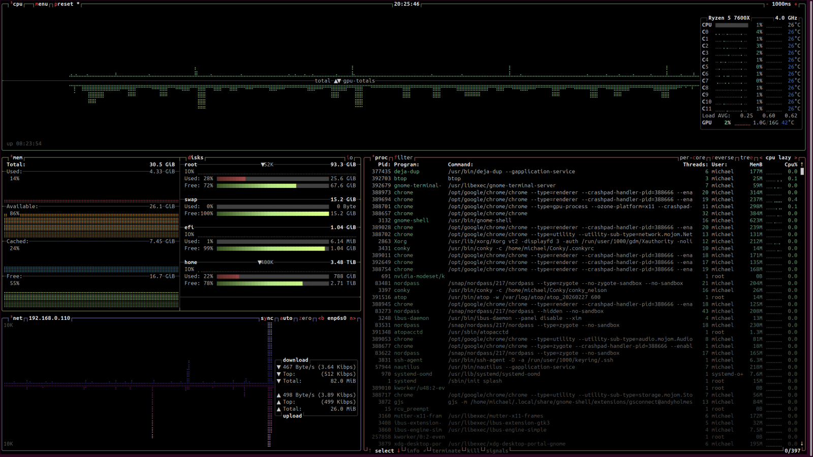 I'll show you all my workstation. 12-core AMD processor 32 GB of RAM and only barely 15% used 4 TB hard drive M.2 chip (22% used for home data, 28% used for the OS system (root) 1Gbit Network (CAT6 Cable) As you can see, my workstation has all the common-sized stuff that most Windows PCs today are build with. So now...I want anyone to post up the amount of memory used on their Windows 10 or Windows 11 PCs. My uptime is low because I had a kernel update for the machine, so a reboot is required. Hard drive usage is low for 4TB hard drive yet. Perk bonus for linux users. No more defragging hard drives, no more anti-virus software, nor malware scanning of your machine. Being that I isolated my OS system to its own partition this makes the system secure too. Since the OS system files are tucked away like this, and if there is any reason I need to reinstall my Ubuntu, due to a screw up on a setting or a crashed system, there is no problem. I can reload the operating system completely with no ill effect to the personal data. This is done by partitioning your drive so the operating system is not part of the home folder. Now, during the reinstall, just notify Ubuntu where each folder is and tell the software not to format the home folder. It will remain untouched. The only catch is having to reinstall your other software. Anyone willing to show off their Windows PC?
