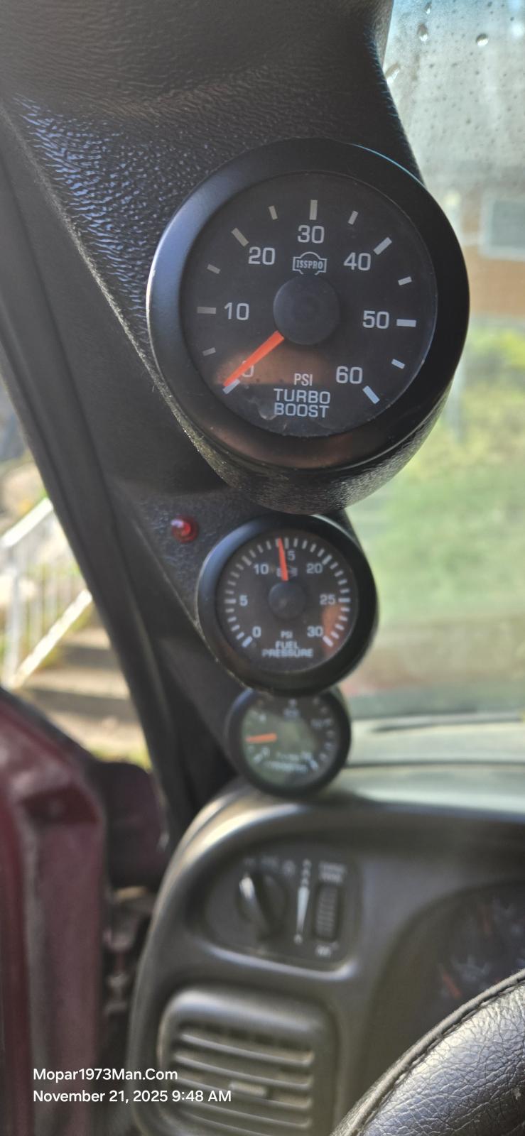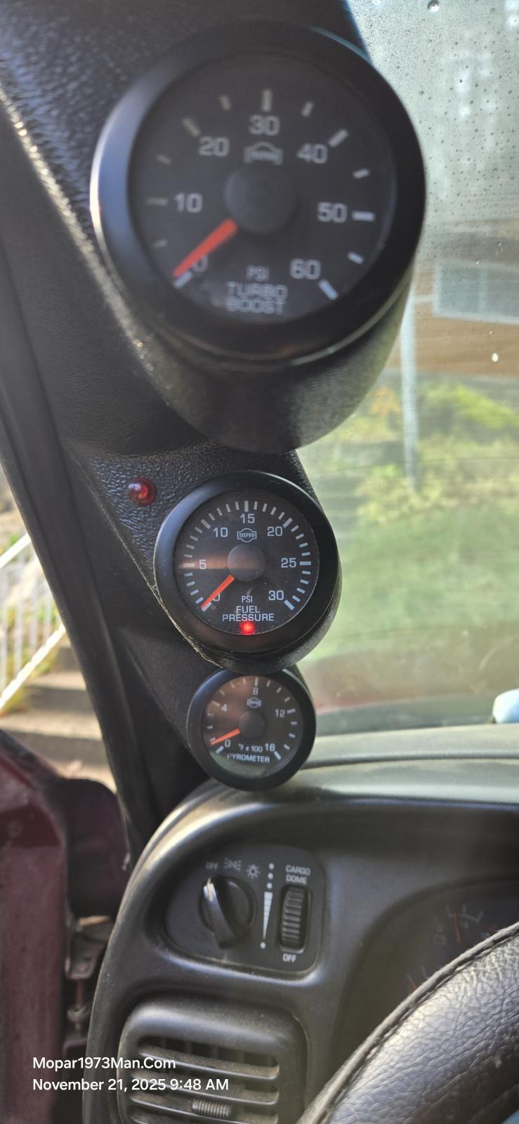 Key on engine off Cold start and idling 38°F outside temperature. As you see ive done the low pressure light and hated that it requires more plumbing for 2 sensors. I upgraded to programmable gauge. My warning light comes on at 13 PSI or lower.