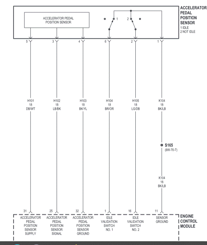 I watched your video - good video. I noticed that as you depressed the accelerator pedal that the accelerator pedal traveled a more than normal distance to get a change in engine rpm, and that the change was sudden (jumped to 1,400 rpm). The idle validation switch is built into the APPS sensor. It appears to be working as the engine idles as it should. Do you have, or have access to a scanner that can read the APPS signal? If so, this could help diagnose whether or not the per cent of APPS signal follows the travel of the accelerator pedal. It could also show an abrupt signal change that times with the sudden rpm change when depressing the throttle. This test could help to determine if the APPS sensor should be replaced. APPS / ECM circuit is shown below: John