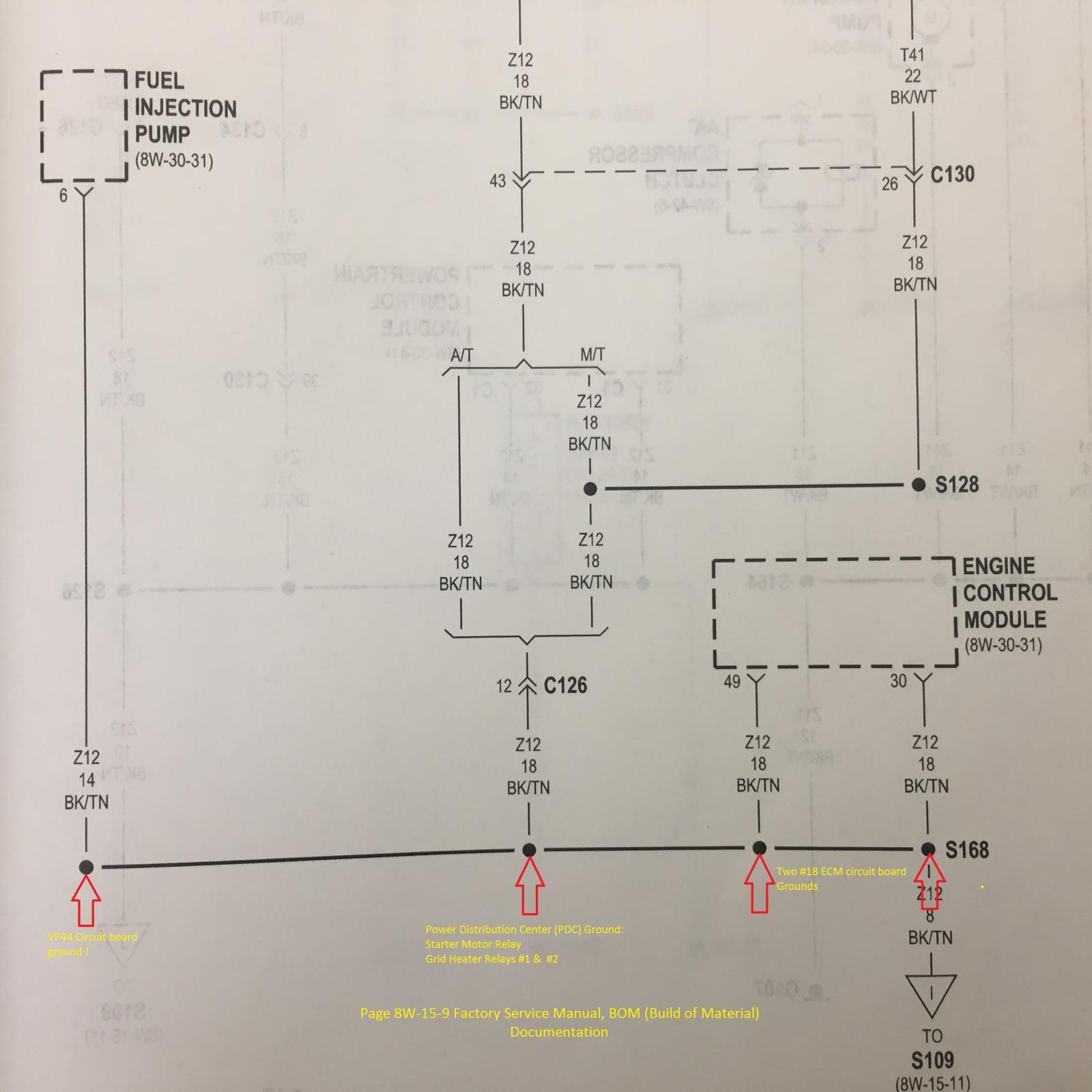 Good documentation on your part for your initial post regarding this problem. You definitely need to figure this out - you have a good truck with low miles. I don't know if you have a good wiring diagram for the engine controls, so I am posting a diagram below. I suspect that the collision with the rock wall is related to your symptoms. A couple of questions, though: Did the "stutter" show up right after the collision, or after the VP44 replacement? How much time and miles elapsed between the collision and the VP44 replacement? You mention testing the red / white wire from the PDC - I am assuming this is the wire that supplies power to the ECM and the injection pump. If so, I would continue to check voltage (engine running and voltage spikes occurring) downstream from there. As you can see in the wiring diagram, Joint Connector #2 (inside the PDC) and Splice #161 are part of that circuit. I would also verify the condition of ground Splice 168 to Ground 125 on front of engine. If you are using another ground connection point with your test lead and there is truly a ground problem in the ECM / injection pump circuit ground, you will get a steady voltage reading because you are bypassing the potential ground fault. Also, I believe there is one more splice that is not shown in the diagram - that would be S109 that is between S168 and G125. Are you familiar with the W-T ground reference modification? If so, has it been done? John