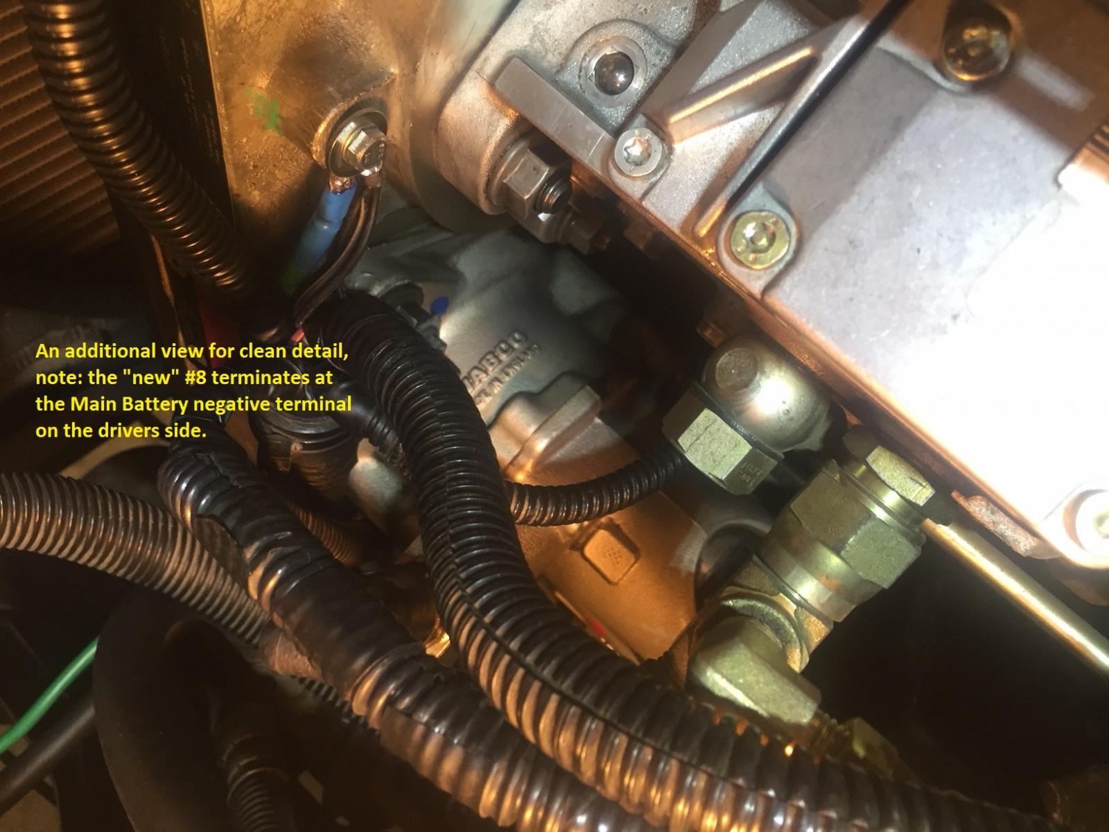 You wrote, "I've decided to do some upgrades to my cables & connections before digging any deeper. Marine grade battery terminals should be in tomorrow." Good plan! Are you referring to ground splice 168 (top photo below)? If you are, then the W-T ground mod wasn't complete. This splice is disassembled and all wires are routed to the front gear case cover with an additional wire to driver side battery ground (see bottom photo). John