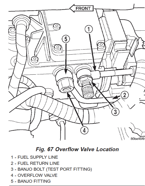 It appears that the lift pump is doing its job. Were you able to hold a specific pressure - say, 15 psi - while you filled the bucket? Overflow valve removal, testing, and installation from the FSM below. No o-rings, just two sealing washers at the banjo fitting. If the sealing washers appear to be okay, I would re-use them - just carefully check for leaks after reassembly. John REMOVAL, TESTING, AND INSTALLATION The overflow valve (pressure relief valve) is located at the outside of fuel injection pump (Fig. 67). It con- nects the fuel return line (banjo fitting) to the pump. The valve has no internal serviceable parts and must be replaced as an assembly. Two sealing gaskets are used. One gasket is located between pump and banjo fitting. The other is located between the banjo fitting and end of valve. A rubber tipped blow gun with regulated air line pressure is needed for this test. (1) Clean area around overflow valve and fuel return line at injection pump before removal. (2) Remove valve from pump and banjo fitting. (3) Discard old sealing gaskets. (4) Set regulated air pressure to approximately 97 kPa (14–16 psi). (5) Using blow gun, apply pressure to overflow valve inlet end (end that goes into injection pump). (6) Internal check valve should release, and air should pass through valve at 97 kPa (14–16 psi). If not, replace valve. (7) Reduce regulated air pressure to 10 psi and observe valve. Valve should stay shut. If not, replace valve. (8) Install new sealing gaskets to valve. (9) Install valve through banjo fitting and into pump. (10) Tighten to 30 N·m (24 ft. lbs.) torque.